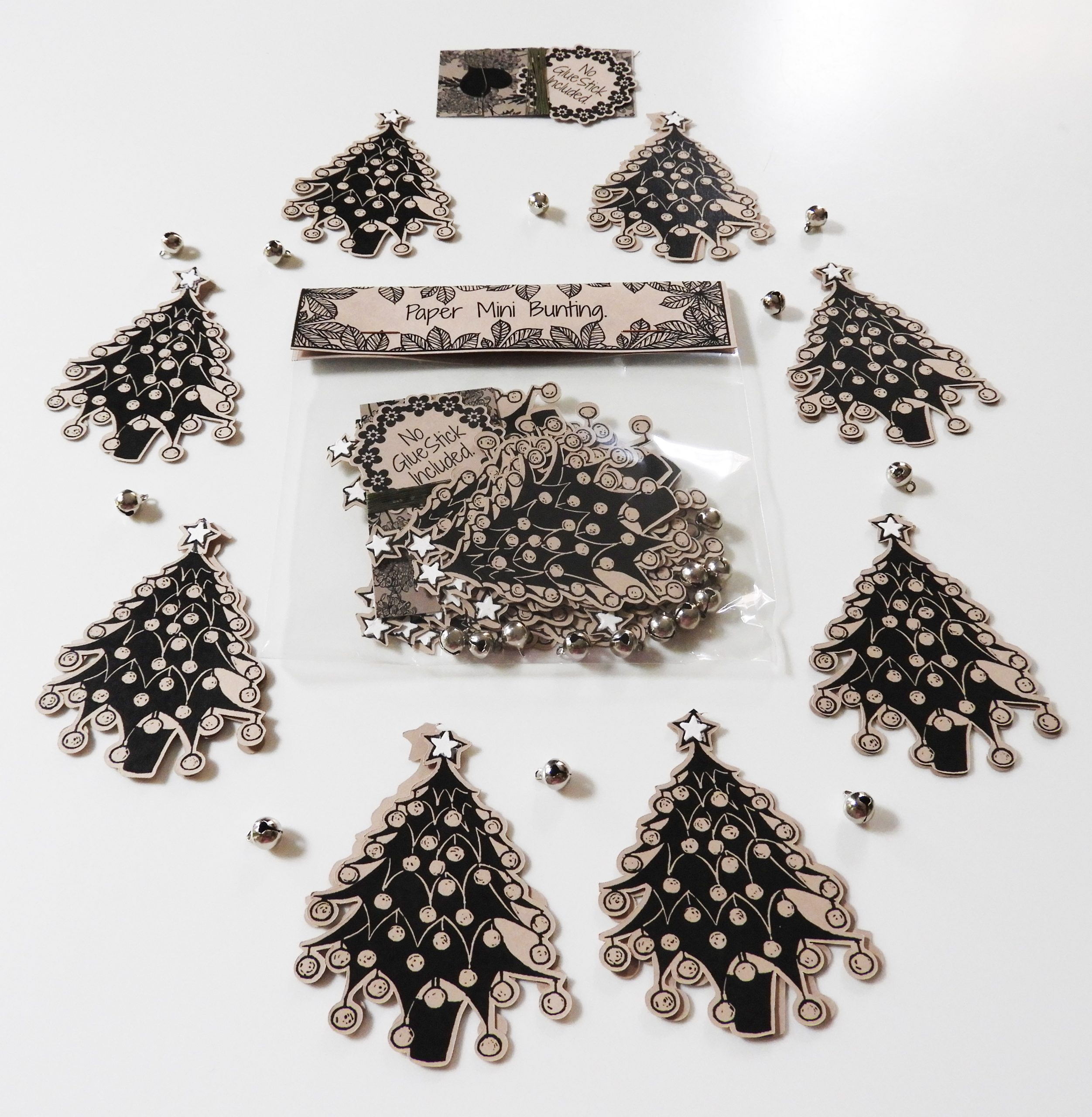 Christmas Tree D.I.Y Paper Bunting comes with approximately 16 motif, equal fronts and backs and the cotton. Plus paper stars and mini metal bells. Using a glue stick, glue both sides of each motif and stick together along the string ensuring that they are bottom heavy, i.e the cotton is nearer the top. These look great over a fireplace or a bedstead.  I used cotton for its delicacy as it tends to disappear into the background and focus is on the motif. Made from 250g 80% recycled heavy paper. Because these are double sided they can hang in a window or in doorways and look the same from any view. Kept separate they can make twice the length of bunting, or be used as die cuts for card making or invites etc. Each kits easily makes 1.2m of bunting, twice if used individually. All the motif are taken from my linocuts and heavily influenced by Victorian decorations.