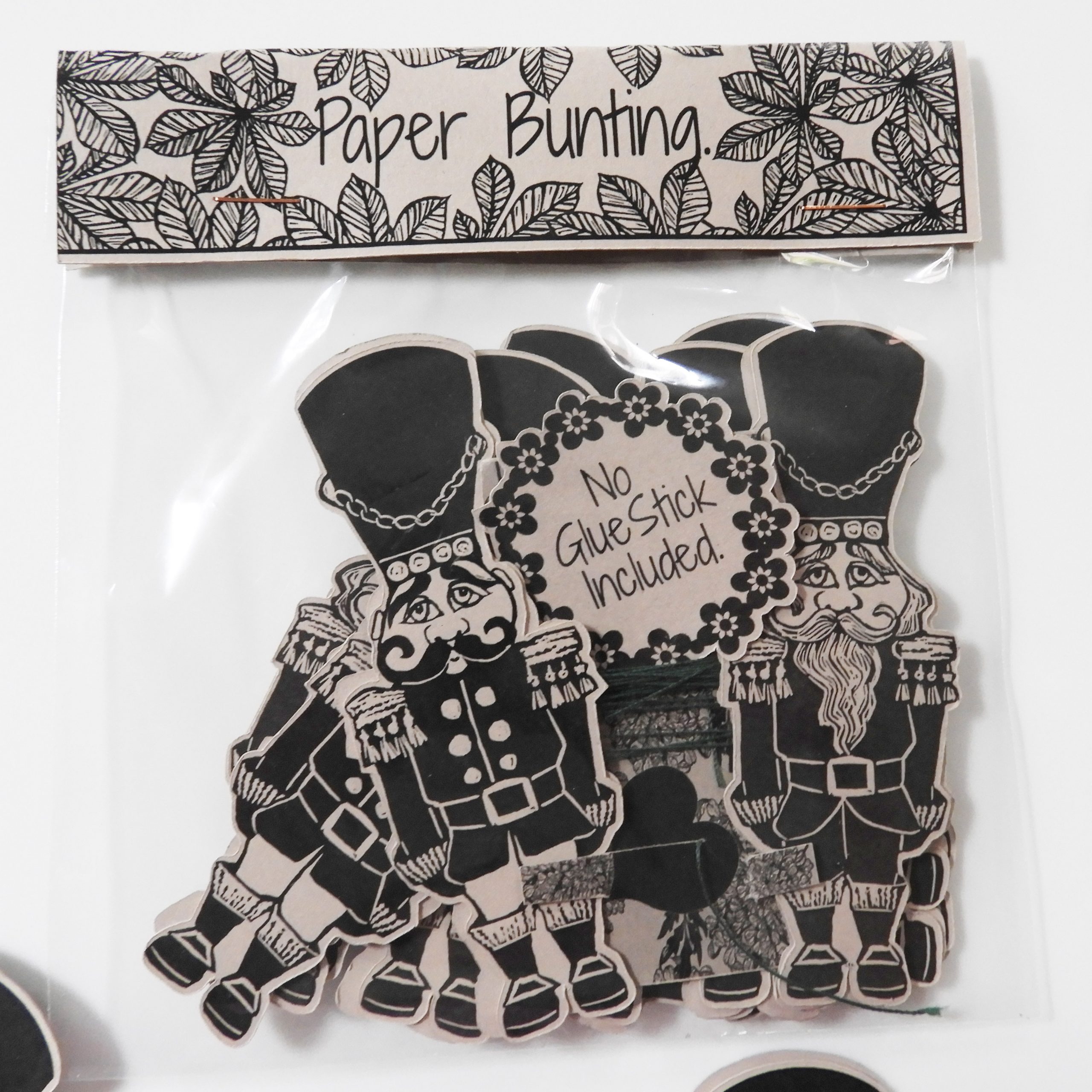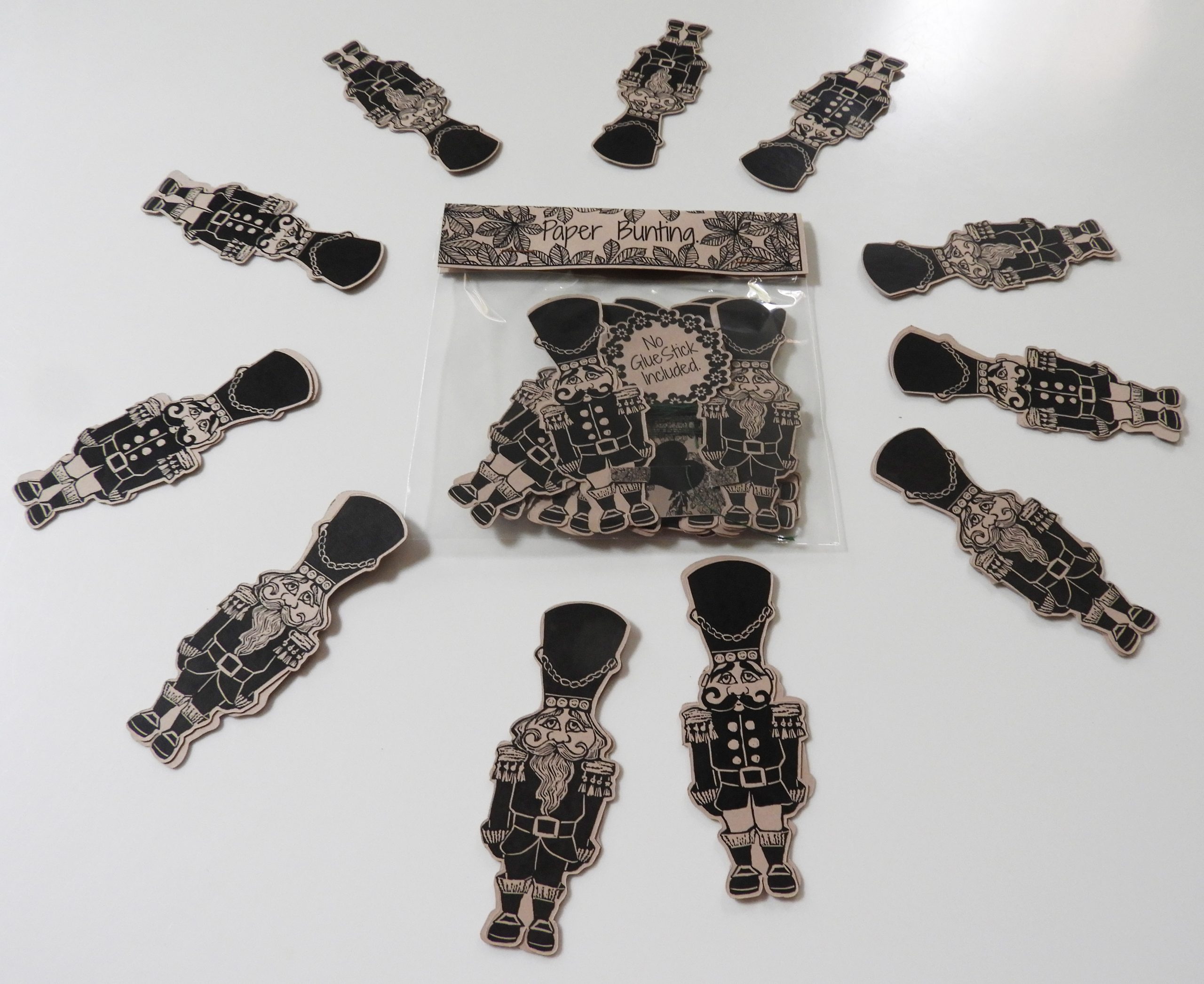 Little Christmas Soldier D.I.Y Paper Bunting comes with approximately 22 motif, equal fronts and backs and the cotton Using a glue stick, glue both sides of each motif and stick together along the string ensuring that they are bottom heavy, i.e the cotton is nearer the top. These look great over a fireplace or a bedstead.  I used cotton for its delicacy as it tends to disappear into the background and focus is on the motif. Made from 250g 80% recycled heavy paper. Because these are double sided they can hang in a window or in doorways and look the same from any view. Kept separate they can make twice the length of bunting, or be used as die cuts for card making or invites etc. Each kits easily makes 1.2m of bunting, twice if used individually. All the motif are taken from my linocuts and heavily influenced by Victorian decorations.