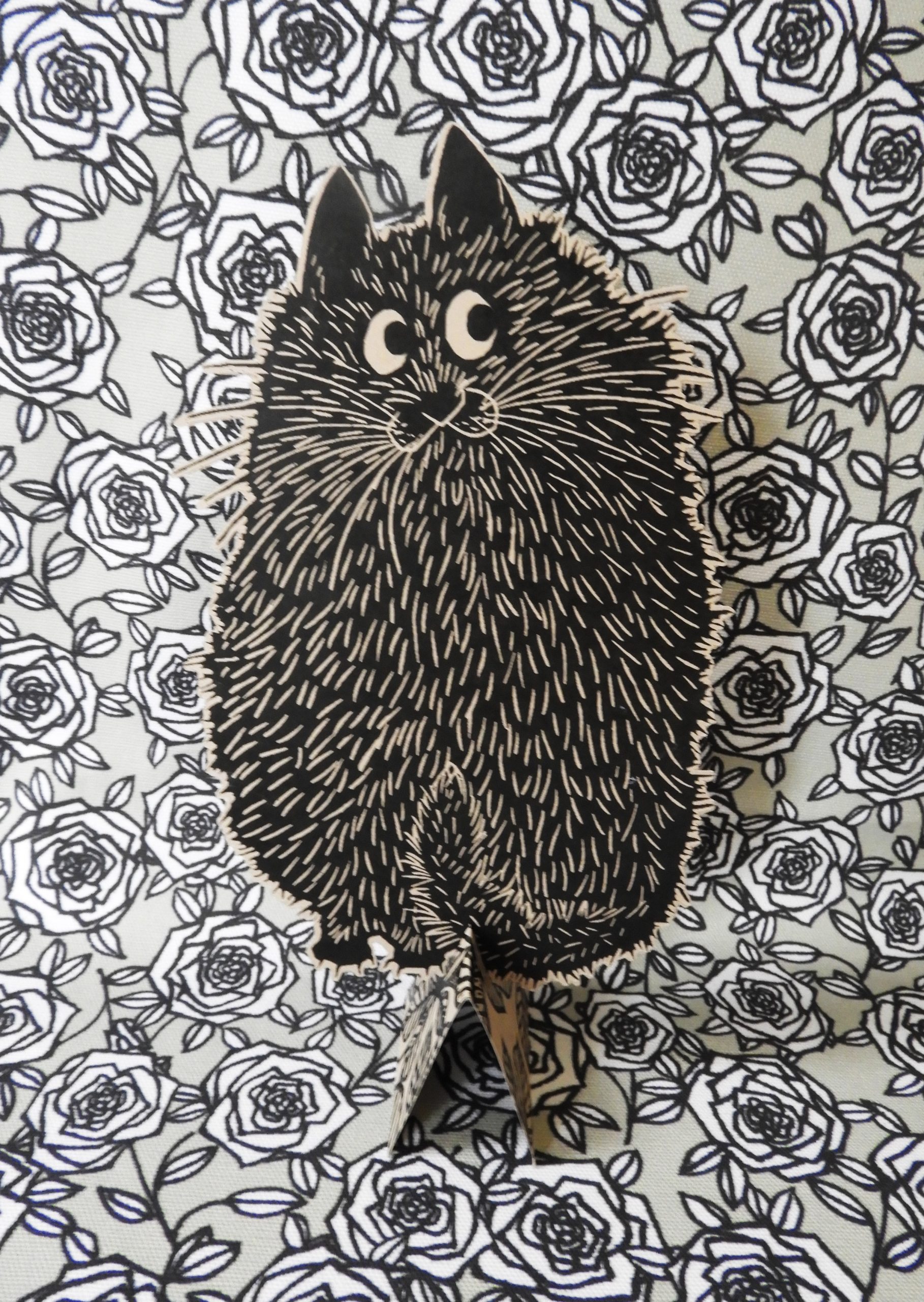 Please note, these Paper Sculptures are made only from a heavy paper, printed both sides and two sheets glued together for added strength. They sit in a stand made from the same paper which has been recycled from scraps. This Lucky Black Cat measures 12 x 23 cm and can stand anywhere, looking out of the window or on the bookcase.