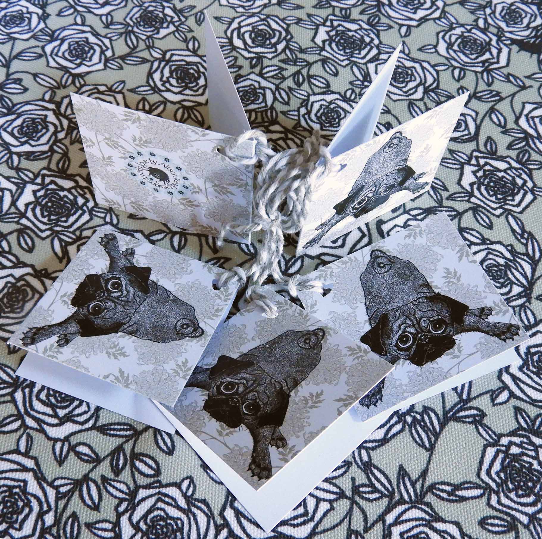 Brigitte Bardog On White with Green Chrysanthemums Gift Tags x 6