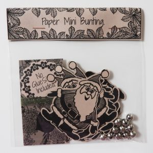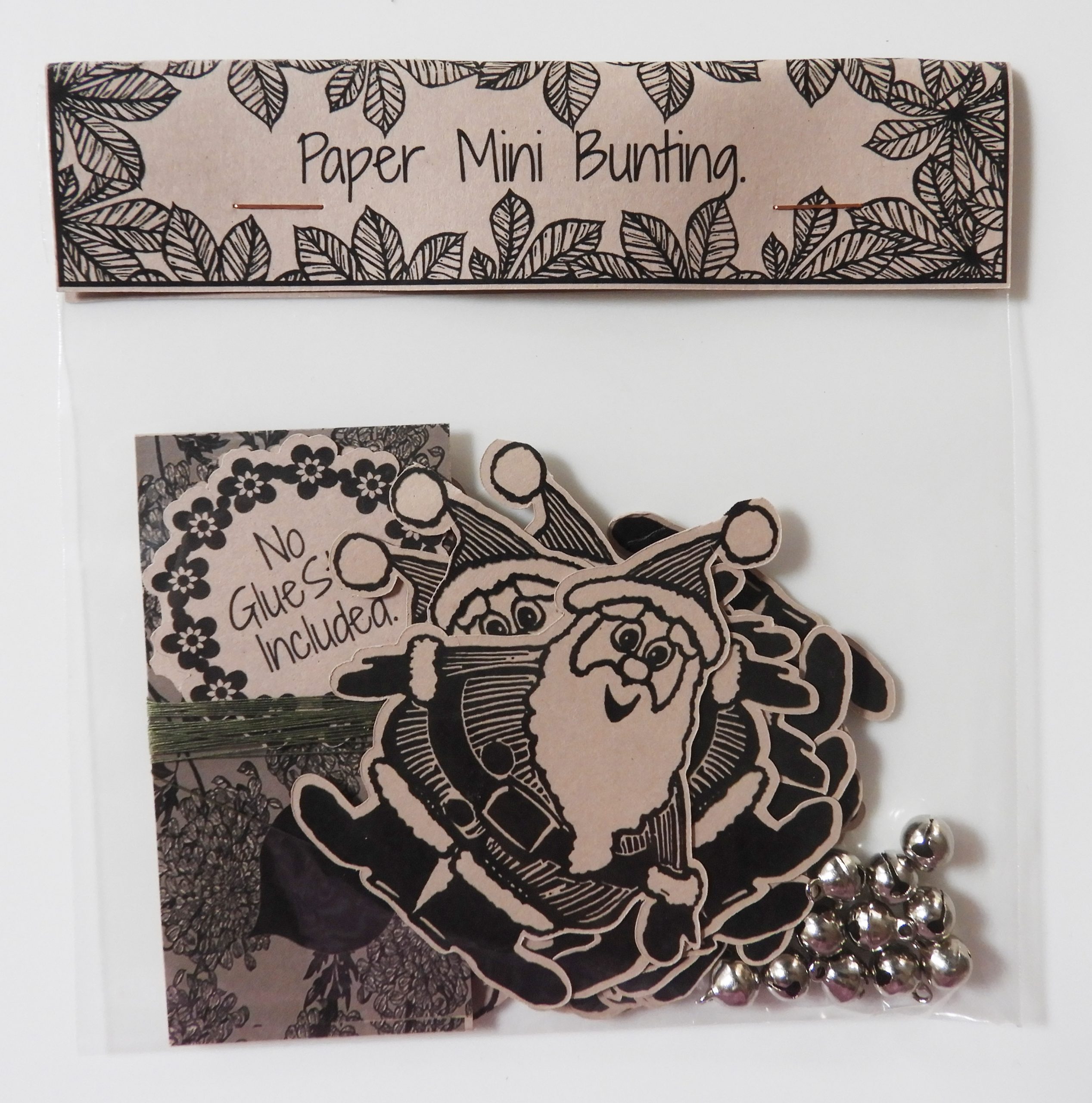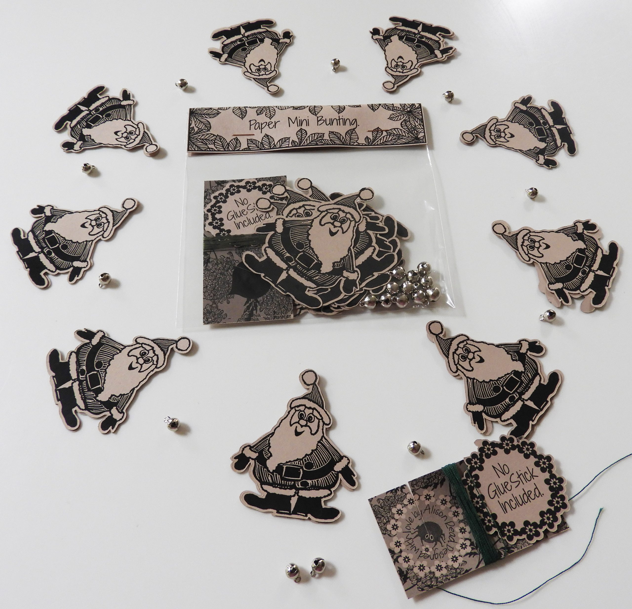 Santas with Bells D.I.Y Paper Bunting comes with approximately 18 motif, equal fronts and backs and the cotton. Plus mini silver bells. Using a glue stick, glue both sides of each motif and stick together along the string ensuring that they are bottom heavy, i.e the cotton is nearer the top. These look great over a fireplace or a bedstead. I used cotton for its delicacy as it tends to disappear into the background and focus is on the motif. Made from 250g 80% recycled heavy paper. Because these are double sided they can hang in a window or in doorways and look the same from any view. Kept separate they can make twice the length of bunting, or be used as die cuts for card making or invites etc. Each kits easily makes 1.2m of bunting, twice if used individually. All the motif are taken from my linocuts and heavily influenced by Victorian decorations.